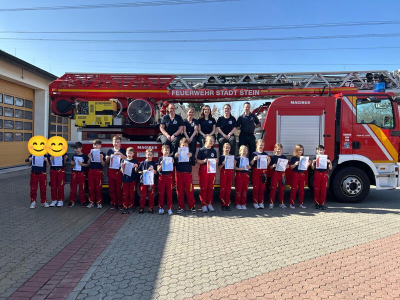 Am Ende konnten Steins erster Bürgermeister Kurt Krömer, der Brandschutzreferent der Stadt Stein Robert Bauer, die Kreisjugendfeuerwehrwartin Pia Wunschik, der stellvertretende Kreisjugendfeuerwehrwart Oliver Franke sowie die Betreuerinnen und Betreuer der Jugendfeuerwehr Stein allen angetretenen Jugendlichen zur bestandenen Prüfung der Jugendflamme gratulieren. Auch die Feuerwehr Stein gratuliert ganz herzlich.
