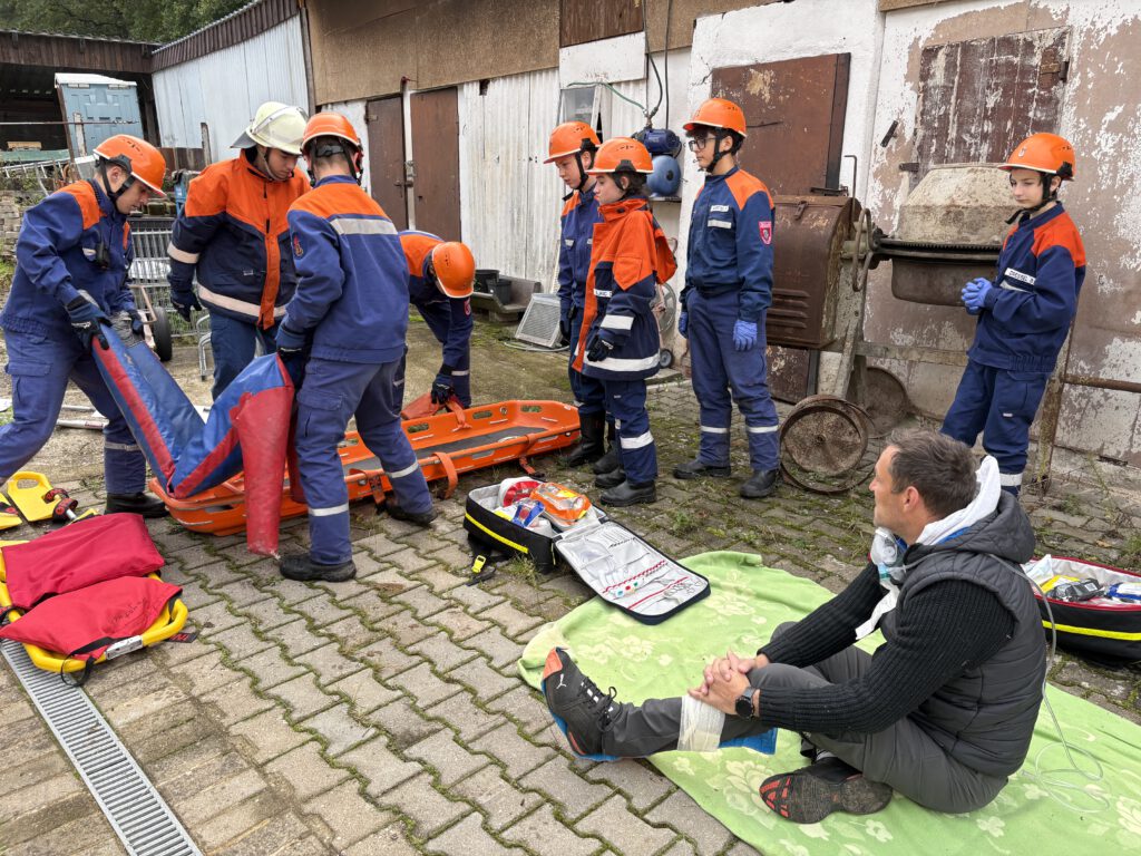 Es handelte sich hierbei natürlich immer um gestellte Übungsszenarien, die von den Jugendfeuerwehrbetreuern organisiert wurden. Für die Jugendlichen kamen hingegen alle Einsätze überraschend. In insgesamt zwölf Einsätzen stellten die 23 Jugendfeuerwehrleute ihr Können unter Beweis. Die Szenarien reichten von Verkehrsunfällen mit eingeklemmten Personen (hierbei handelte es sich um Puppen/Dummys) über Drehleiterrettungen bis hin zu Personensuchen und Bränden. Bei der Drehleiterrettung vom Dach des Steiner Rathauses verschaffte sich auch Steins erster Bürgermeister Kurt Krömer einen Überblick.