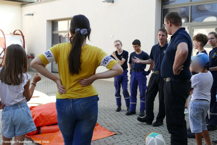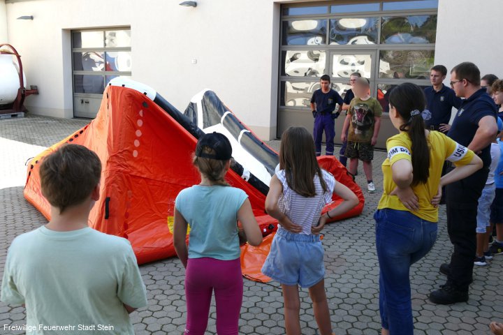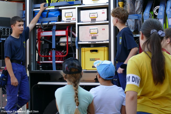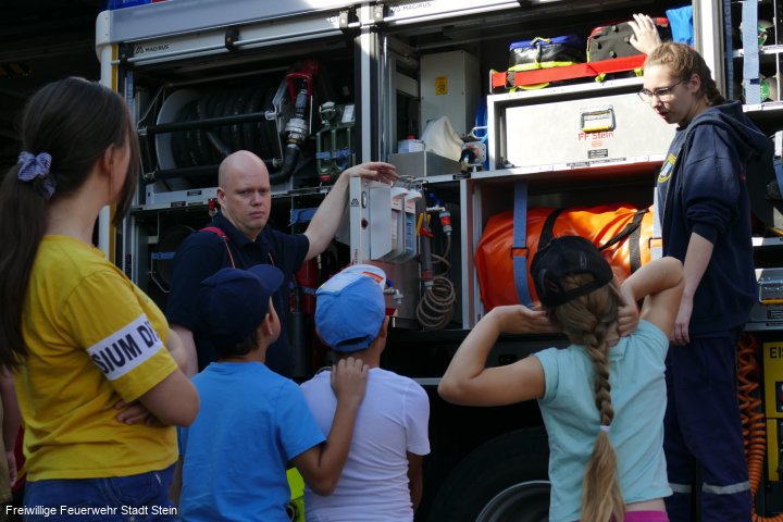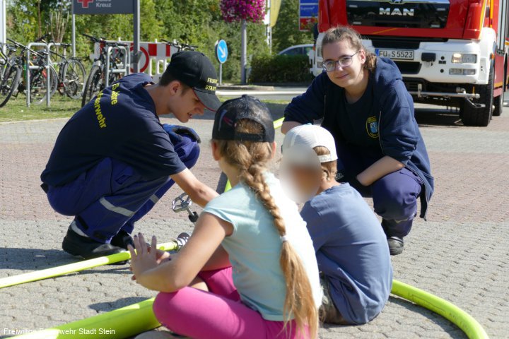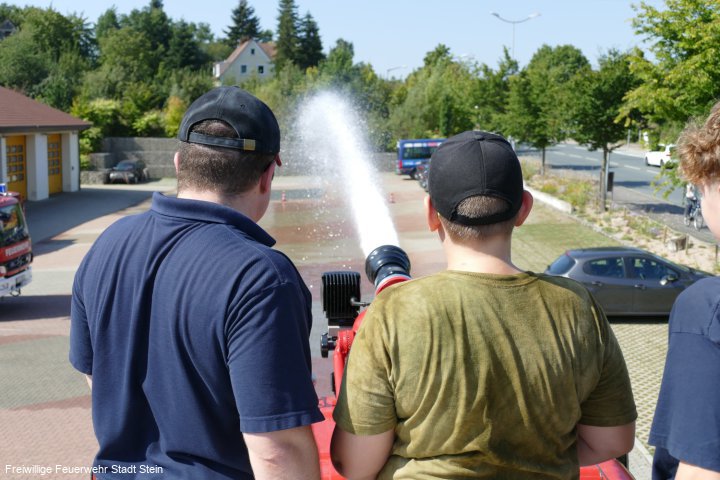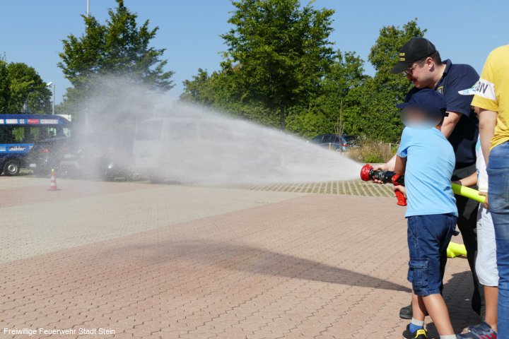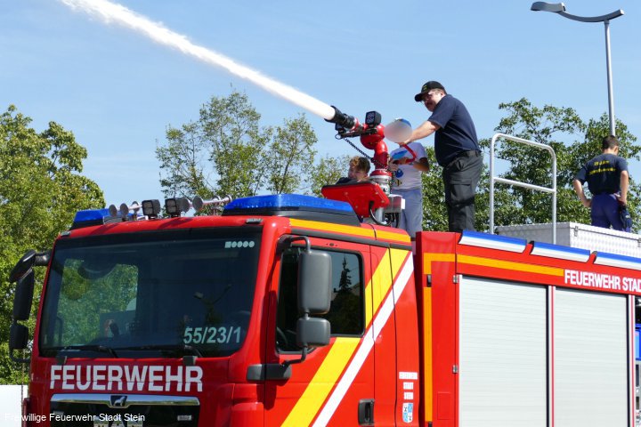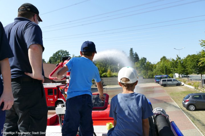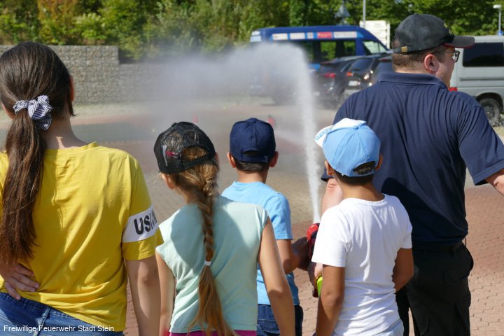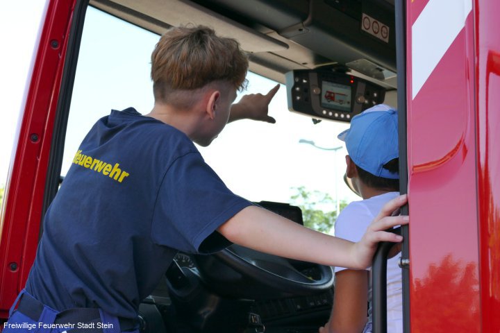 Große rote Autos zum Anfassen: Das und noch viel mehr war am letzten Wochenende der Sommerferien wieder bei der Feuerwehr Stein geboten, und zwar im Rahmen des Ferienprogramms der Stadt Stein.