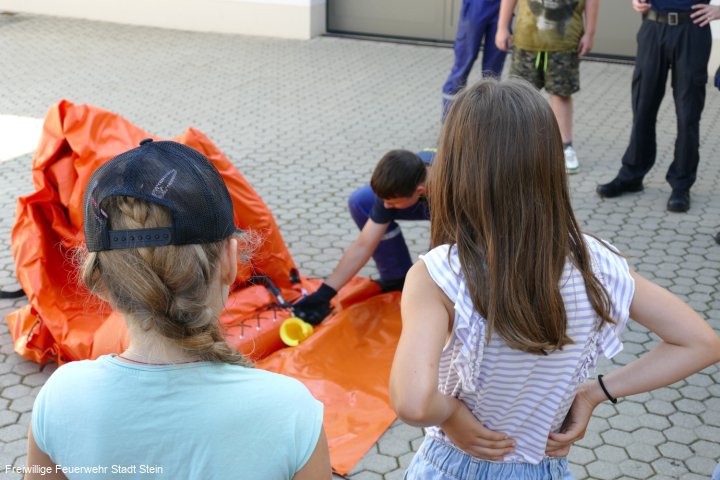 Zwischen Samstag, 10 Uhr und Sonntag, 10 Uhr erlebten 18 Jugendfeuerwehrleute, wie es den Berufsfeuerwehrleuten tagtäglich ergeht. Die Betreuer der Jugendfeuerwehr hatten ein umfangreiches Programm ausgearbeitet. Nach der Fahrzeugübernahme und -einteilung zu Schichtbeginn, wurden erst einmal ein paar Übungen durchgeführt, um alle wieder auf den neuesten Stand zu bringen: Wie nimmt man bei einem verunfallten Motorradfahrer den Helm korrekt ab? Wie stellt man eine Steckleiter korrekt an einem Gebäude auf? Welche Möglichkeiten zur Beleuchtung von Einsatzstellen im Dunkeln gibt es? Im Anschluss wurde das Nachtlager auf der Feuerwache in Stein aufgebaut. Nach dem Mittagessen wurde es dann ernst: gleich zwei Verkehrsunfälle beschäftigten die jugendlichen Einsatzkräfte. Zum Einen waren ein Traktor und ein Fahrrad am Waldsportparkplatz an der Mühlstraße kollidiert, zum Anderen hatte ein Motorradfahrer die witterungsbedingt rutschigen Straßen unterschätzt und ist auf der alten B14 von der Straße abgekommen. Beide Einsätze wurden souverän durch die Nachwuchskräfte abgearbeitet. Direkt danach ging wieder ein Alarm durch die Feuerwache: Diesmal fuhren alle gemeinsam nach Bertelsdorf zu einem gemeldeten Garagenbrand. Vor Ort konnten die Jugendlichen echtes Feuer und Rauch (dargestellt durch Nebelmaschinen) sehen und daher einen Eindruck gewinnen, wie so ein Szenario in der Realität ausschauen könnte. Auch Steins Erster Bürgermeister Kurt Krömer begleitete diesen Einsatz und zeigte sich bei der Nachbesprechung beeindruckt. Er dankte dem Engagement der Jugendlichen und auch dem der Betreuer, ohne die dieser 24h-Tag nicht möglich wäre. Anschließend durften sich alle bei leckerem Kuchen auf der Wache stärken. Als das nächste Mal der Alarm losging, gab es wieder zwei unterschiedliche Ereignisse gleichzeitig. Am Parkplatz des Palm Beach beim Skaterpark war eine Person unter einen Baumstamm geraten und musste befreit werden. Gleichzeitig wurden die First Responder zu einem medizinischen Notfall auf einer Dachterrasse eines Wohnhauses gerufen. Der Zugang zu der Terrasse gestaltete sich jedoch schwierig, sodass die Drehleiter und weiteres Personal nachalarmiert werden mussten. Korrekt ausgestattet konnte die Person dann vom Dach gerettet werden. Nach den ersten ereignisreichen Stunden sollte es nun etwas ruhiger werden. Einige durften noch einmal mit der Drehleiter hoch hinaus, andere nutzten die Zeit für Spiele während das Abendessen vorbereitet wurde. Nun kam allerdings ein realer Einsatz dazwischen. Schnell wurden die Fahrzeuge einsatzbereit gemacht und die Jugendlichen konnten beobachten, was bei einem echten Einsatz auf dem Gelände der Feuerwehr passiert. Nach dem Abendessen gab es ein entspanntes Abendprogramm: Entweder konnte man es sich am Lagerfeuer gemütlich machen oder man nutzte das improvisierte Kino in der Fahrzeughalle. Die Ruhe wurde dann abrupt gestört. Ein Hubschrauber sollte in Stein am Spielplatz an der Gerasmühler Straße landen. Bei dieser Dunkelheit musste der Landeplatz ausgeleuchtet werden. Am Ende stellte sich heraus, dass es sich um eine Drohne handelte – leider stand kein echter Helikopter zur Verfügung. Nach einer einsatzfreien Nacht wurden dann alle morgens um 6 Uhr mit einem Alarm geweckt. Die Brandmeldeanlage des Stifteherstellers Faber Castell hatte ausgelöst. Der komplette Löschzug fuhr los, um sich zu vergewissern was los war. In diesem Fall hatte die Anlage einen Fehlalarm ausgelöst. Nach dem Frühstück ging es dann nach Sichersdorf, dort brannte es auf einem landwirtschaftlichen Betrieb. Diese Abschlussübung verlangte den Jugendlichen noch einmal ihr ganzes Können ab. Im Anschluss wurde die Wache aufgeräumt, die Fahrzeuge wieder einsatzbereit gemacht und gegen 10 Uhr konnte der 24h-Tag beendet werden.