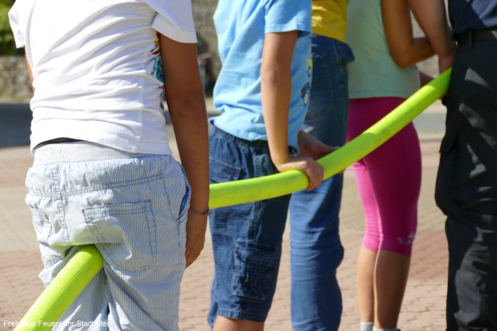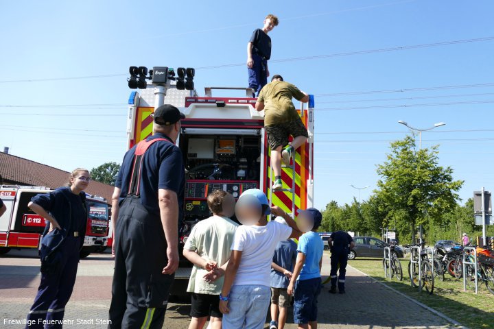 Wie immer hatten die Aktiven ein buntes Potpourri zusammengestellt: So konnten sich die angemeldeten Kinder die Ausrüstung der Einsatzfahrzeuge zeigen und erklären lassen, die begrenzte Sichtweite von Feuerwehrleuten in einem vernebelten Raum erleben, eine Puppe in ein Sprungpolster fallen sehen, mit Schläuchen spritzen, Schlauchboot fahren und auf der Drehleiter in die Vogelperspektive gehen. So hatten die jungen Gäste auf der Feuerwache nochmal einen erlebnisreichen Tag vor dem Ende der Ferien – von dem sie für den ersten Schultag viel zu erzählen mitnehmen konnten.
