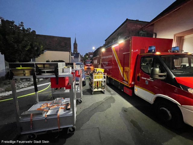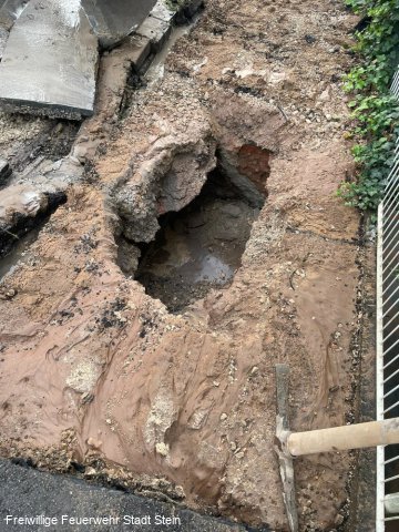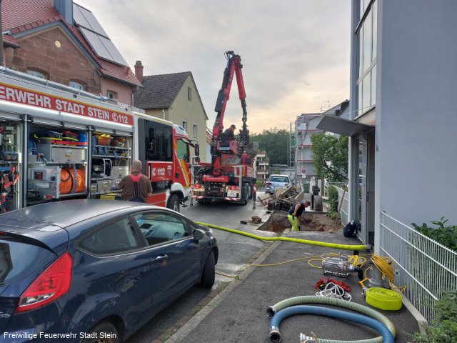 Am vergangenen Sonntag (01.09.) rückte die Feuerwehr Stein zu einem Wasserrohrbruch in der Luitpoldstraße aus. Dort war eine Hauptwasserleitung unter dem Gehweg geplatzt. Das ausdringende Wasser hatte den Lichtschacht eines angrenzenden Gebäudes geflutet und war in die Kellergeschosse eingedrungen. Die Einsatzkräfte der Feuerwehren Stein und Weihersbuch drehten vor Ort die Hauptwasserleitung ab und verständigten die Stadtwerke Stein. Anschließend begannen sie, die Kellerräume mit sechs Pumpen und drei Wassersaugern leerzupumpen. Parallel begann eine Straßenbaufirma, den Asphalt aufzureißen und die Wasserleitung freizugraben. Das Leerpumpen der Keller zog sich über mehrere Stunden bis in den späteren Vormittag hin. Kurz nachdem die Feuerwehren abgerückt und zur Wache zurückgekehrt waren, ging eine First-Responder-Alarmierung ein, um die sich die ohnehin anwesenden Einsatzkräfte abschließend noch kümmerten.