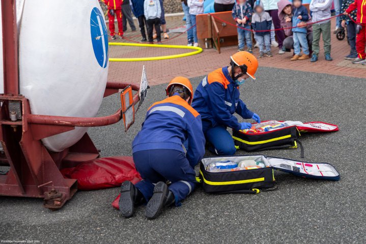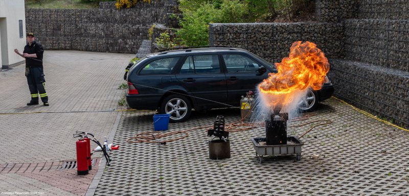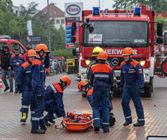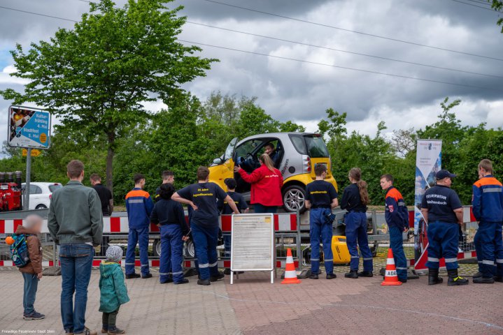 So stellte beispielsweise die Jugendfeuerwehr bei einer Schauübung ihr Können unter Beweis stellen: Die Nachwuchskräfte zeigten, wie sie eine Person, die unter einer Last eingeklemmt ist, mit Hilfe von Hebekissen befreien. Außerdem demonstrierten die Steiner Feuerwehrleute, was passiert, wenn man versucht, einen Fettbrand mit Wasser zu löschen. Den ein oder anderen umstehenden Gästen wurde dabei selbst mit Sicherheitsabstand kurzzeitig etwas wärmer.