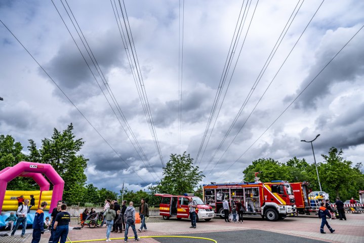 Außerdem fehlten auch in diesem Jahr natürlich nicht die Rundfahrten in den Einsatzfahrzeugen. Die Aktiven der Steiner Wehr drehten dafür in den großen roten Autos regelmäßig ihre Runden, zum Beispiel im Hilfeleistungslöschfahrzeug (HLF). Wer hoch hinaus wollte, konnte auf der Drehleiter in bis zu 30 Metern Höhe die Aussicht auf das Stadtgebiet genießen – oder wahlweise die Regenwolken beobachten, die an diesem Nachmittag leider auch zwischenzeitlich über die Feuerwache zogen. Die kleinen Gäste konnten sich in der Zwischenzeit auf der Hüpfburg austoben.