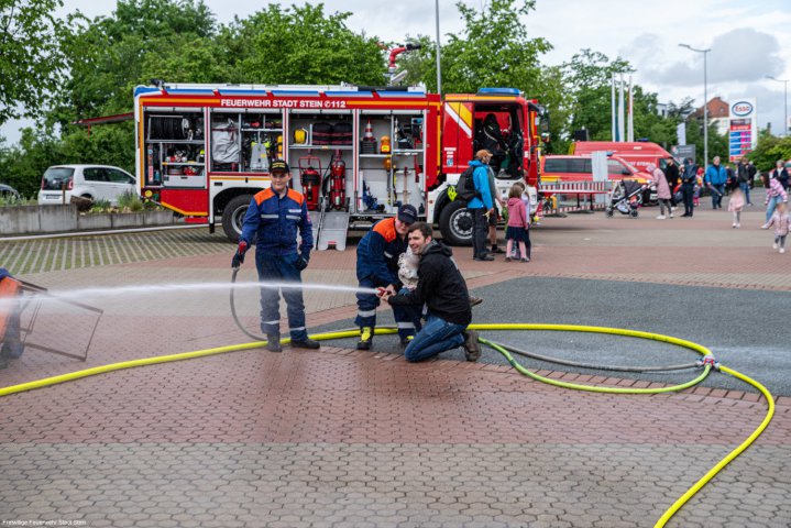 Normalerweise brausen Feuerwehrautos mit lauten Tatütata vorbei, wenn man sie auf der Straße sieht. Beim Stadtfest Stein Anfang Mai standen sie aber alle aufgereiht auf dem Gelände der Feuerwache und warteten darauf, bestaunt zu werden. Dazu gab es wie immer ein buntes Programm, das die Mitglieder der Feuerwehr Stein auf die Beine gestellt hatten.