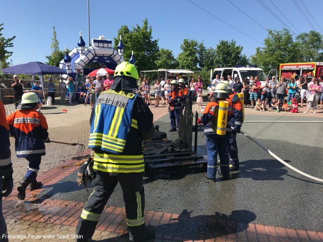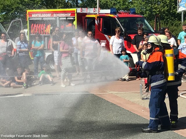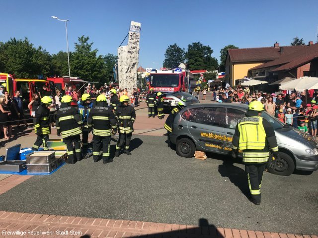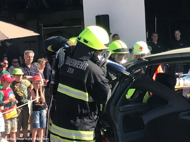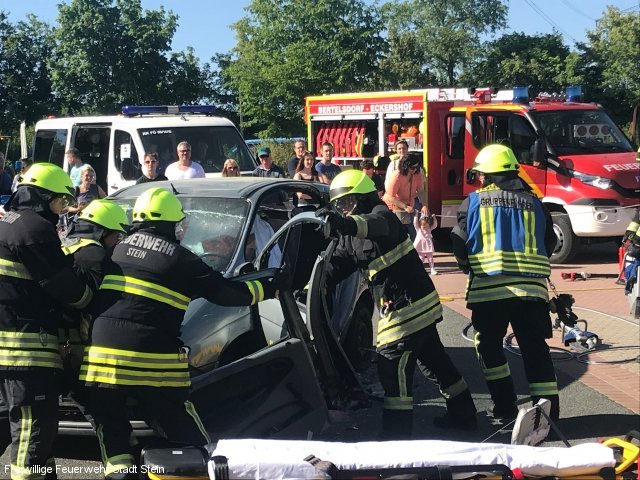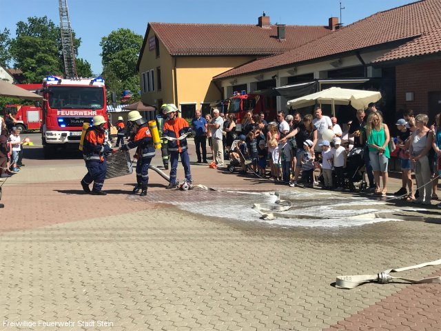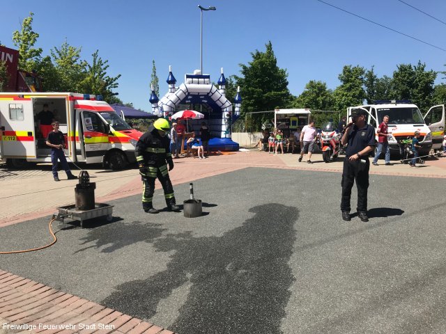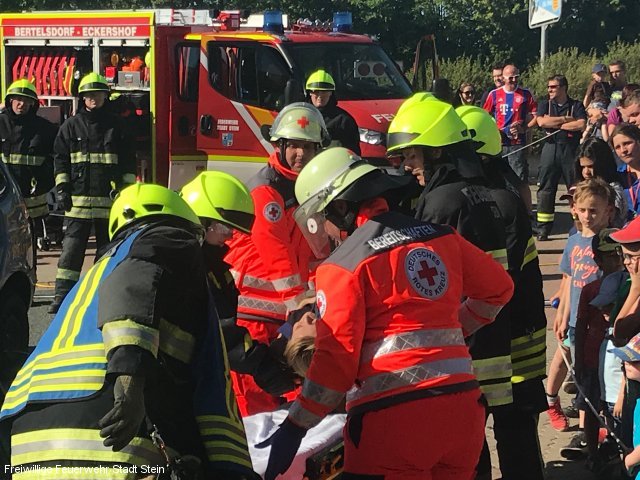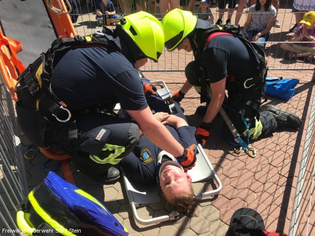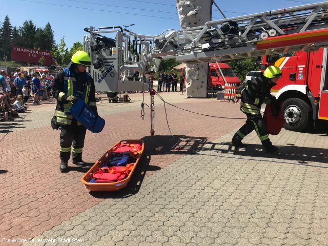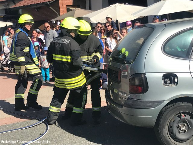 Vorgeführt wurde eine Schachtrettung, bei der mit der Drehleiter und dem Flaschenzug eine Person aus einem Schacht gerettet wurde. Die Jugendfeuerwehr löschte ein Holzhaus und versorgte zusammen mit dem BRK zwei verletzte Freizeitsportler. Was passiert, wenn man Fett mit Wasser löscht wurde ebenfalls demonstriert. Abschließend wurde noch eine Person achsengerecht aus einem PKW gerettet.