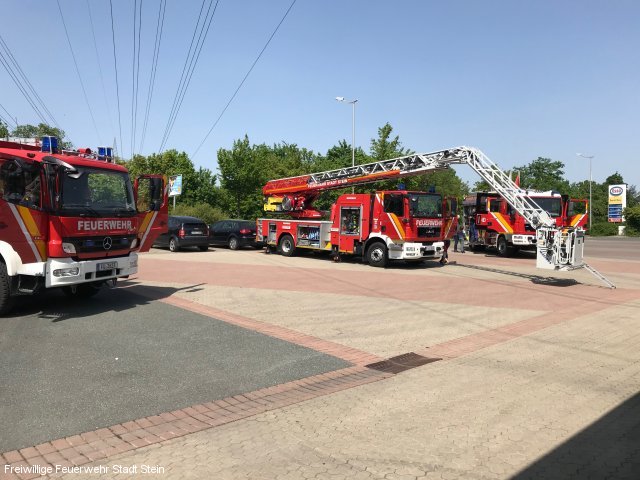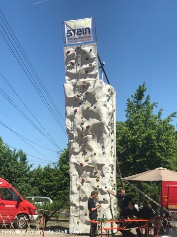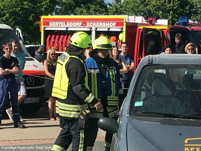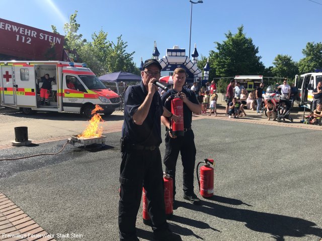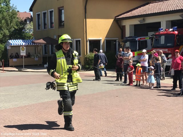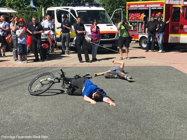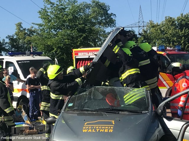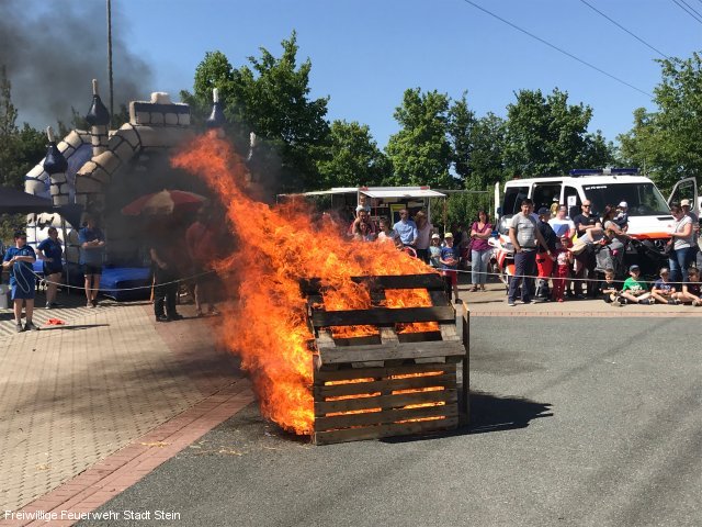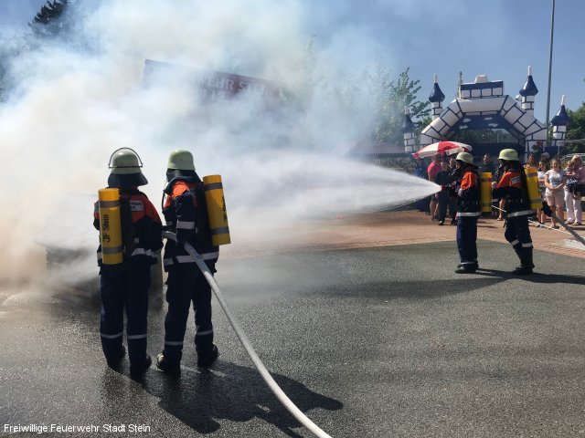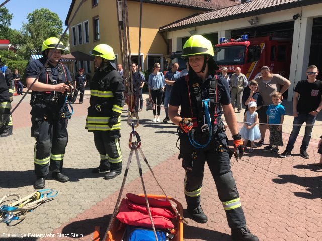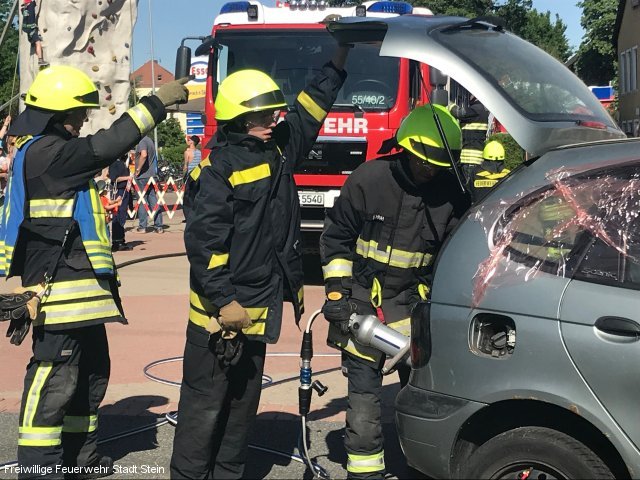 Vorgeführt wurde eine Schachtrettung, bei der mit der Drehleiter und dem Flaschenzug eine Person aus einem Schacht gerettet wurde. Die Jugendfeuerwehr löschte ein Holzhaus und versorgte zusammen mit dem BRK zwei verletzte Freizeitsportler. Was passiert, wenn man Fett mit Wasser löscht wurde ebenfalls demonstriert. Abschließend wurde noch eine Person achsengerecht aus einem PKW gerettet.