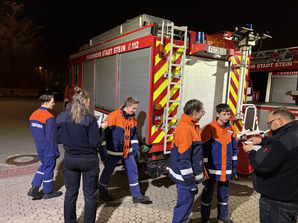 Die heutige Jugendfeuerwehrübung stand ganz im Zeichen der Jugendflamme der Deutschen Jugendfeuerwehr. Insgesamt stellten sich 21 Jugendliche den Herausforderungen dieser Prüfungen. Die Abnahme der ersten Stufe erfolgte durch die Jugendfeuerwehrwartin der Feuerwehr Stein, Isabelle Seidl. Die Disziplinen der Stufe zwei hingegen wurden durch die neu gewählte Kreisjugendfeuerwehrwartin Pia Wunschik und ihren Stellvertreter Oliver Franke geprüft.