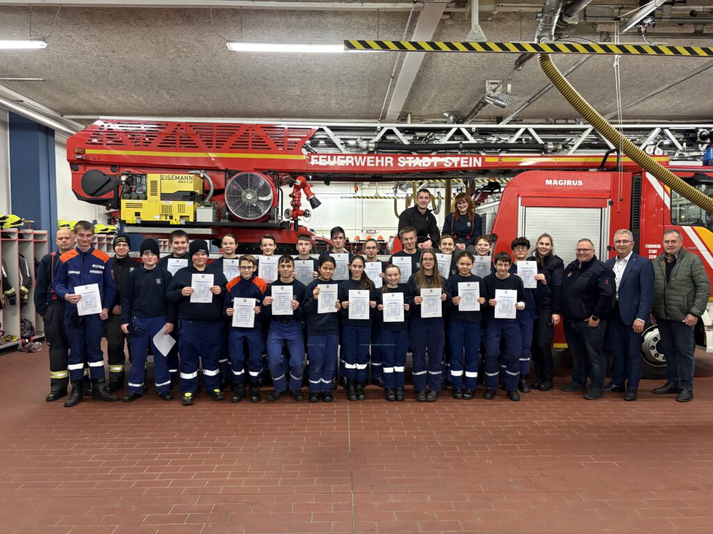 Am Ende konnten Steins erster Bürgermeister Kurt Krömer, der Brandschutzreferent der Stadt Stein Robert Bauer, die Kreisjugendfeuerwehrwartin Pia Wunschik, der stellvertretende Kreisjugendfeuerwehrwart Oliver Franke sowie die Betreuerinnen und Betreuer der Jugendfeuerwehr Stein allen angetretenen Jugendlichen zur bestandenen Prüfung der Jugendflamme gratulieren. Auch die Feuerwehr Stein gratuliert ganz herzlich.