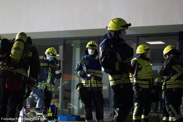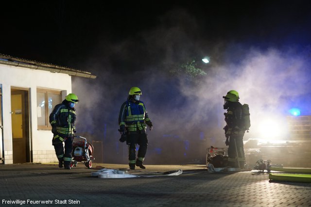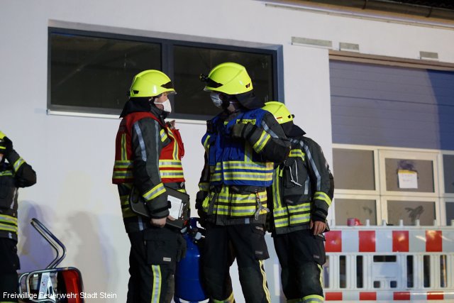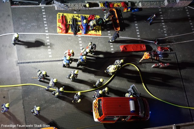 Kellerbrand durch Explosion mit mehreren vermissten Personen: Dieses Szenario bot sich der Feuerwehr Stein bei der Übung am vergangenen Dienstag. Mit mehreren Atemschutztrupps rückten die Einsatzkräfte vor, um den Kellerbrand zu bekämpfen und die vermissten Personen zu suchen. Diesen Auftrag konnten die Feuerwehrleute erfolgreich erfüllen. Allerdings ereignete sich weiteren Verlauf der Übung ein angenommener Atemschutznotfall. Daher rückten mehrere Rettungstrupps zu ihrem verunglückten Kameraden aus und brachten ihn ins Freie. Hierbei wiederholten die mit Atemschutz ausgerüsteten Feuerwehrleute einmal mehr die lebensnotwendigen Handgriffe, um im Notfall schnell Hilfe leisten zu können. Für die Übung hatte ein Steiner Straßen- und Tiefbauunternehmen sein Betriebsgelände zur Verfügung gestellt.