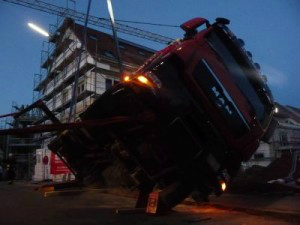 Infolge von Entladearbeiten auf einer Baustelle in Alt-Stein kippte ein 3-Achssattelschlepper mit Ladekran um. Zum Zeitpunkt des Vorfalls befanden sich keine Personen im Fallbereich. Mittels zweier Seilwinden, sowie dem Kranwagen der Berufsfeuerwehr Nürnberg konnte das Fahrzeug wieder aufgerichtet werden.
