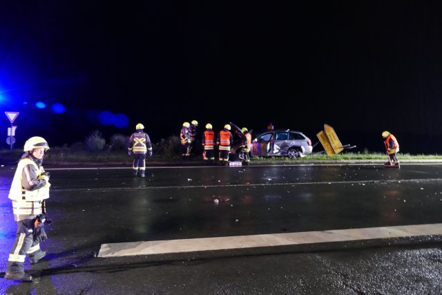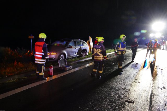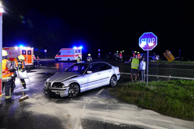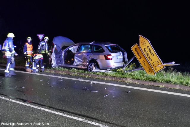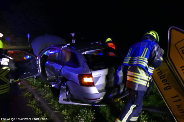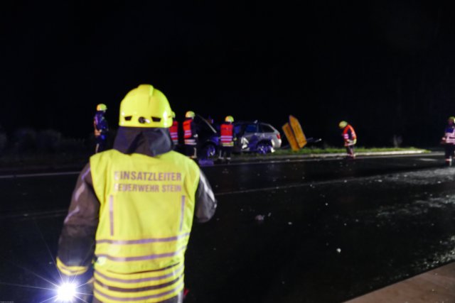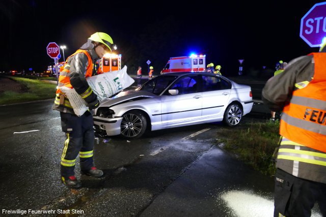Bei einem Verkehrsunfall auf der B 14 bei Gutzberg wurden am späten Dienstagabend drei Personen verletzt. Zwei Fahrzeuge waren dort bei einer Abbiegung kollidiert. Infolge des Unfalls musste die B 14 kurzzeitig komplett gesperrt werden, bis alle Verletzten von den Rettungskräften versorgt waren. Die Feuerwehr Stein reinigte anschließend die Fahrbahn von ausgelaufenen Kraftstoffen und unterstützte die Polizei dabei, den Verkehr zu regeln. Nach etwa zwei Stunden war der Einsatz beendet.